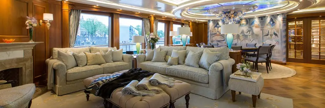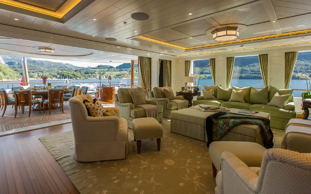 The main salon of charter yacht SEA OWL is a beautiful and spacious area that exudes elegance and warmth. The color palette is light and neutral, featuring a cozy fireplace that adds to the welcoming ambiance. The room is filled with natural light, thanks to fully opening glass doors aft and large windows on either side. The result is an inviting space that allows guests to relax and take in the yacht’s stunning cruising grounds.
