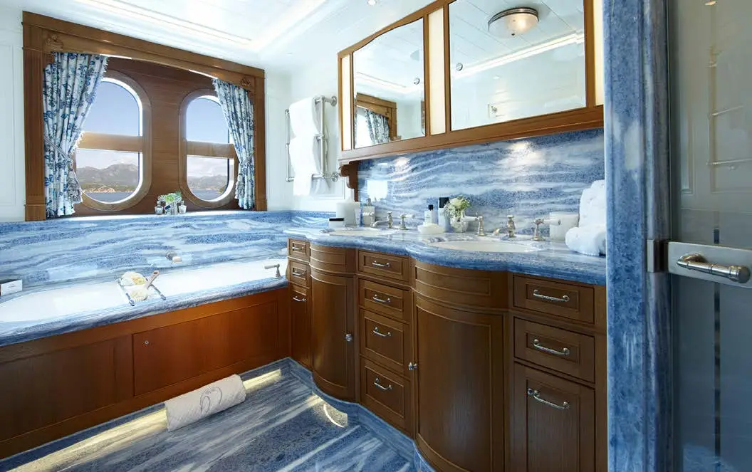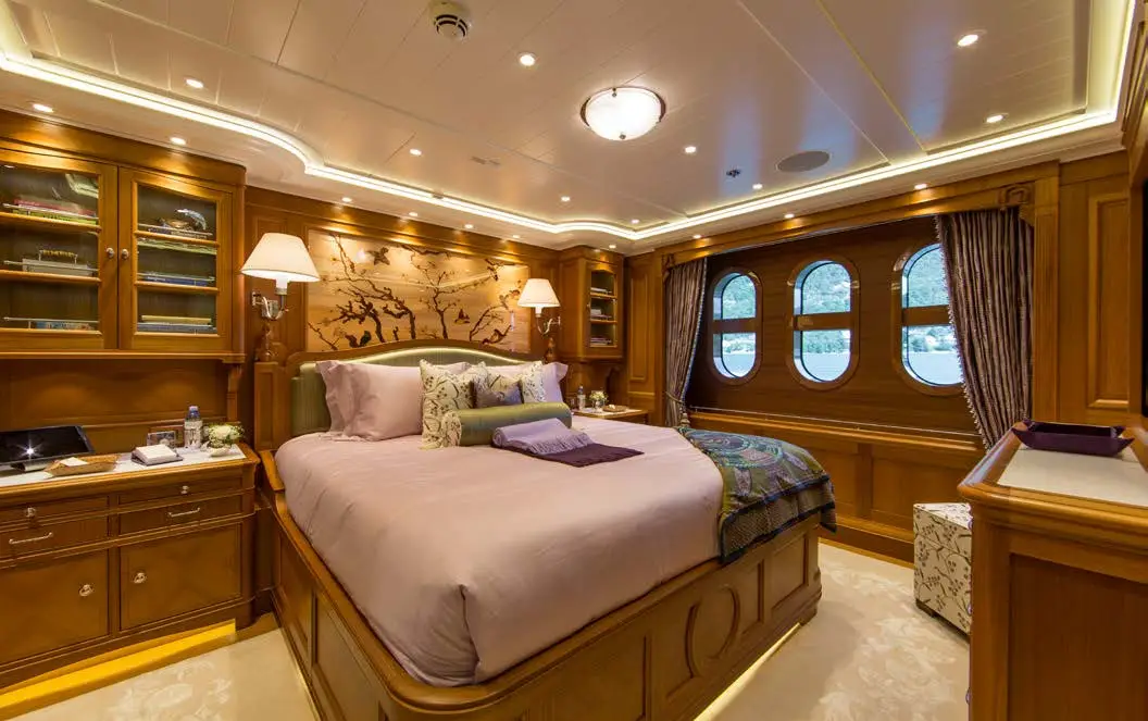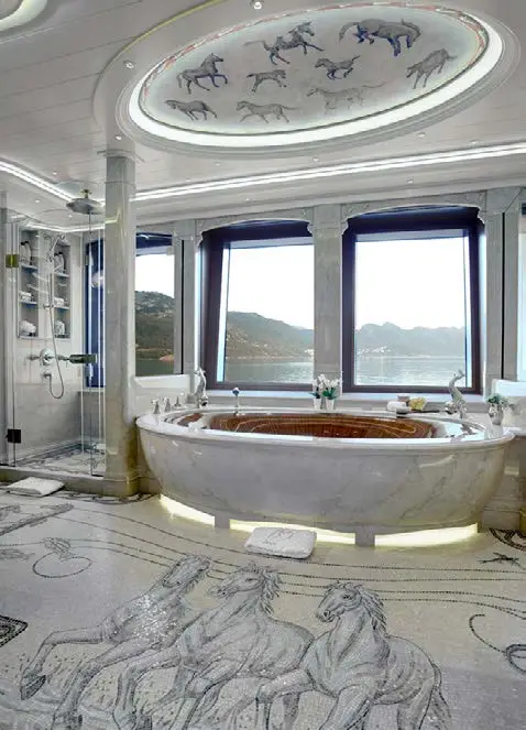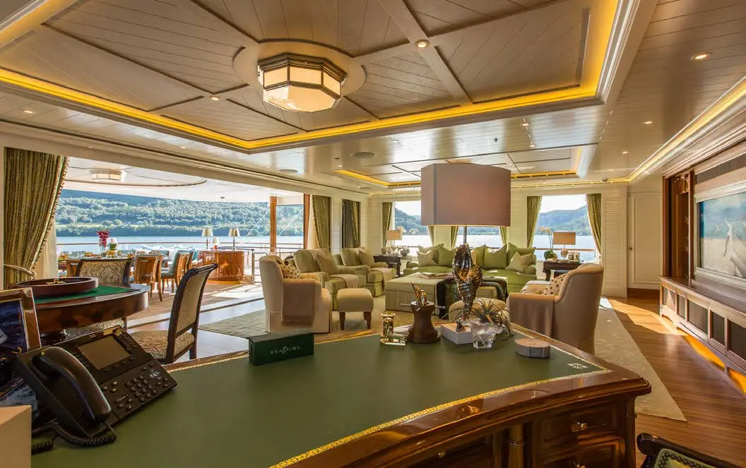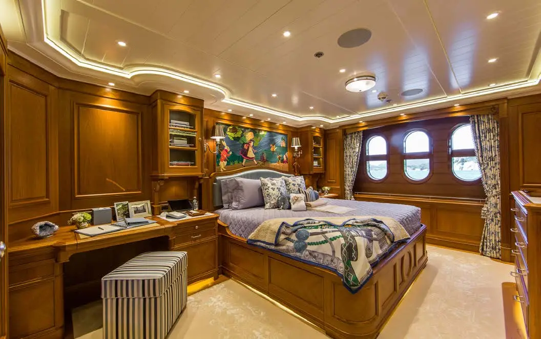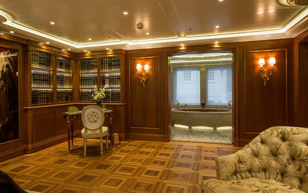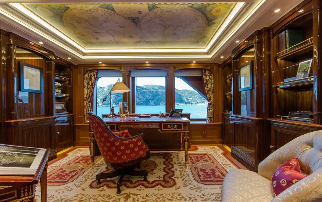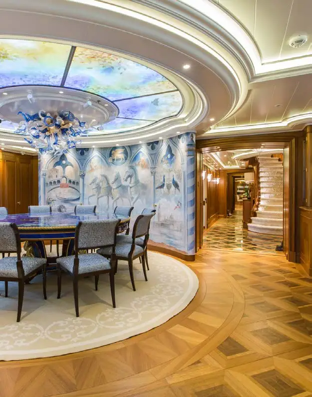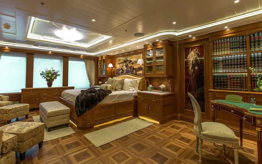 The dining area on SEA OWL is impressive, with a large custom pietre dure table and a stunning Dale Chihuly Venetian glass chandelier. The backdrop features a hand-painted mural that adds to the room’s beauty. The yacht boasts seven staterooms that can accommodate up to 14 guests, each with its own unique theme, including masquerade balls and pirate tales. The master stateroom is located on the main deck and takes advantage of the full beam. There is a dedicated office showcasing a custom replica of an 18th-century French desk. The six guest staterooms are on the lower deck, and three VIP suites all have their own distinct themes. Additionally, there is a cabin that can be used for nannies, staff, or extra guests.