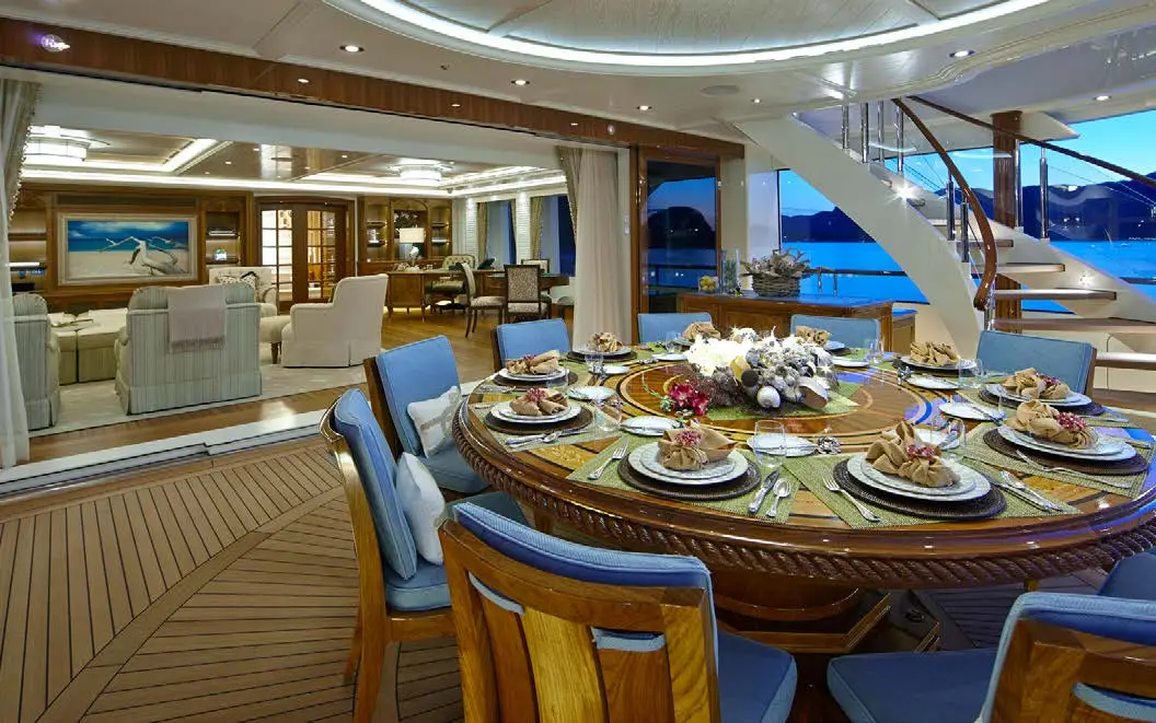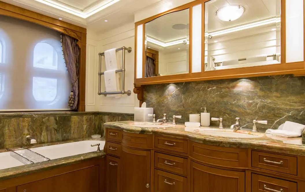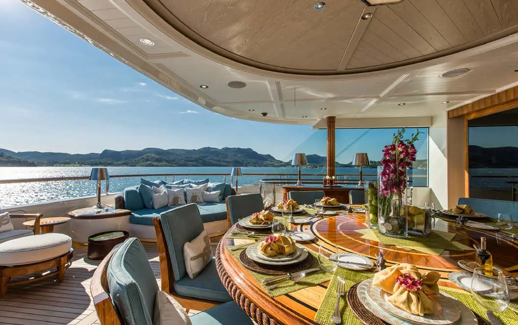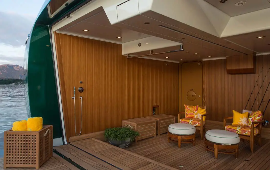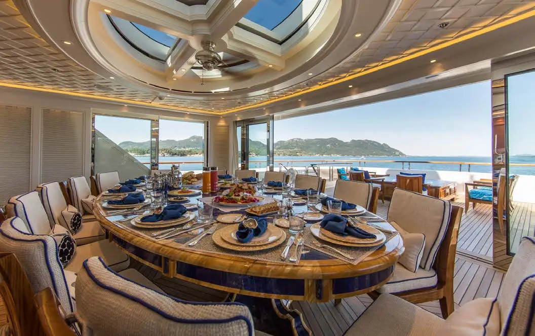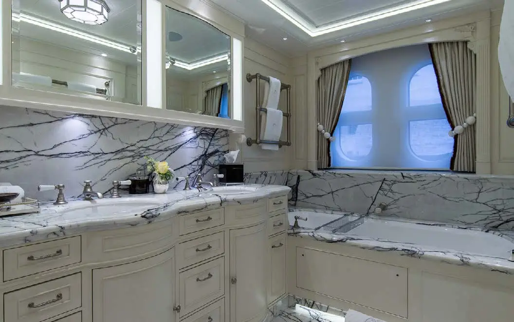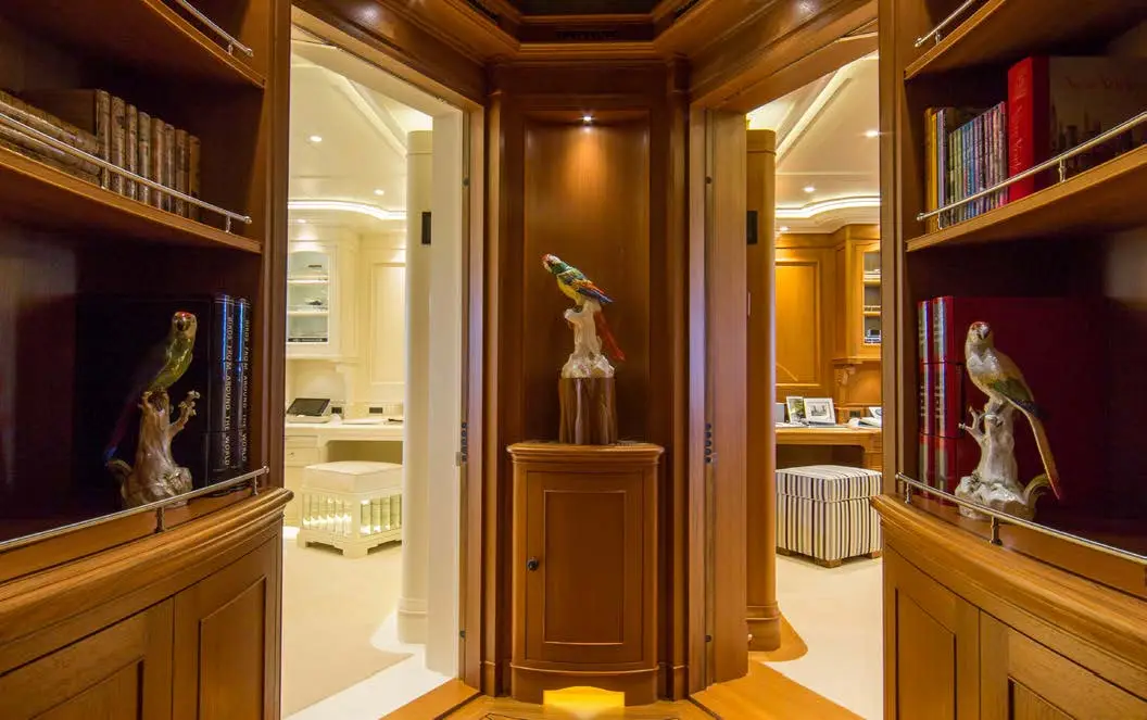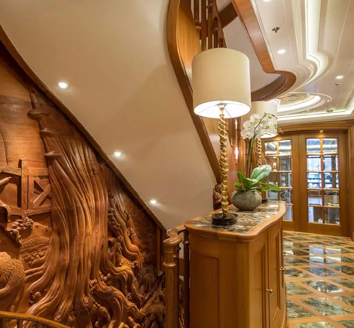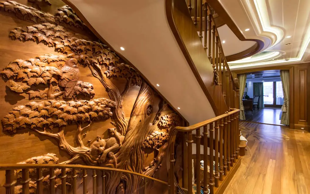 The central staircase of this charter yacht is encircled by the remarkable Tree of Life, a breathtaking masterpiece crafted entirely from Brazilian Mahogany. The hand-carved tree is a true work of art, with intricate details that seem never-ending and captivate the eyes. SEA OWL’s creative interior decor doesn’t stop there, as the custom-painted tromp l’oeil elevator provides access to every deck, showcasing another impressive detail that’s sure to leave an impression.