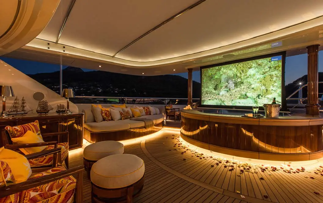 SEA OWL is equipped with two custom Hodgdon tenders, which are discreetly hidden in the forward garage bays. Additionally, there’s a smaller 17-foot (5.2m) RIB located on the foredeck. Guests can access yacht toys via the fold-down swim platform and lazarette area, which provides seamless water access and can also be set up as a beach club at the water’s edge. Charter yacht SEA OWL is equipped with a cutting-edge surveillance and security system, ensuring optimal safety and privacy across the globe. The yacht also boasts unique sensory delights, including a baby grand Steinway and a kaleidescape system.
